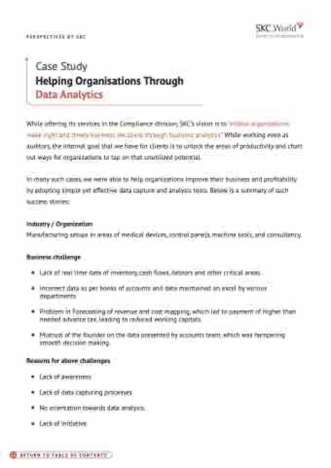 While offering its services in the Compliance division, SKC's vision is to “enable organizations make right and timely business decisions through business analytics”. While working even as auditors, the internal goal that we have for clients is to unlock the areas of productivity and chart out ways for organizations to tap on that unutilized potential.