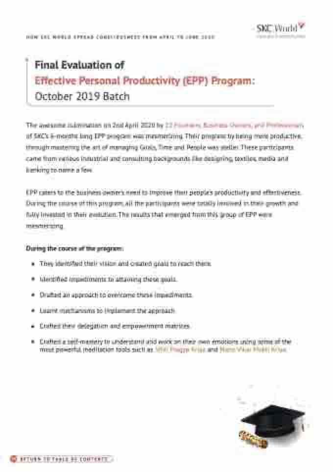 The awesome culmination on 2nd April 2020 by 10 Founders, Business Owners, and Professionals of SKC’s 6-months long EPP program was mesmerizing. Their progress by being more productive, through mastering the art of managing Goals, Time and People was steller. These participants came from various industrial and consulting backgrounds like designing, textiles, media and banking to name a few.