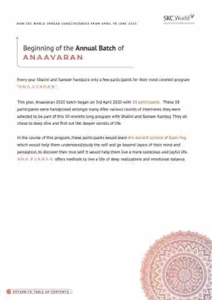 In the course of this program, these participants would learn the ancient science of Gyan-Yog which would help them understand/study the self and go beyond layers of their mind and perception, to discover their true self. It would help them live a more conscious and joyful life. A N A A V A R A N offers methods to live a life of deep realizations and emotional balance.