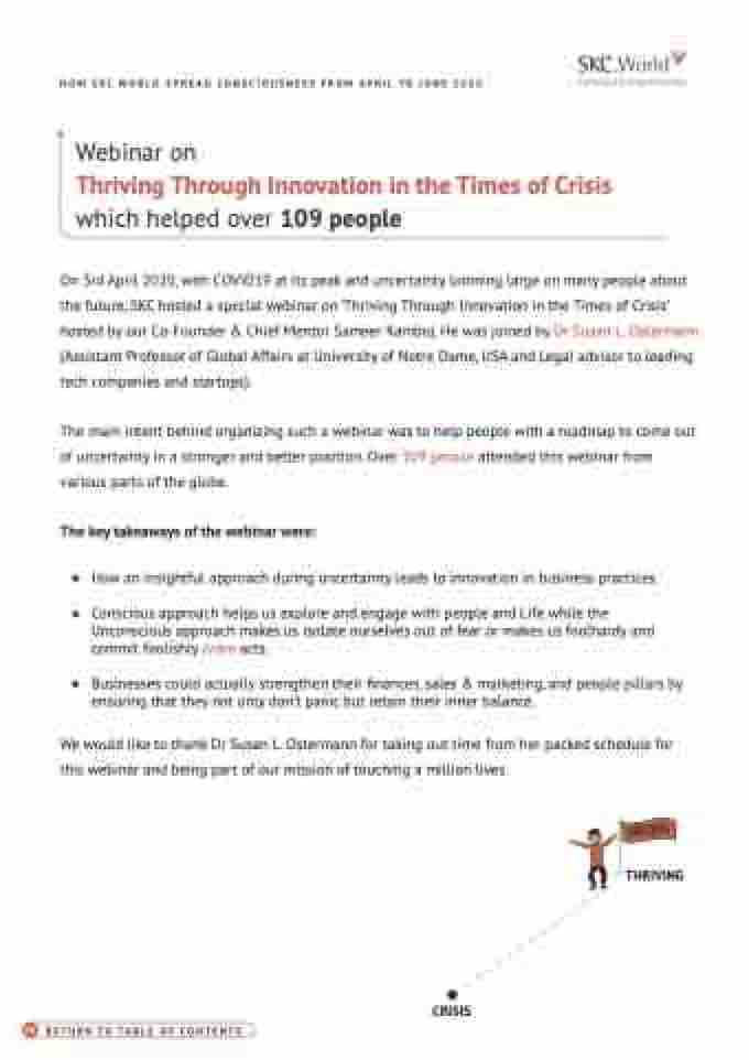 On 3rd April 2020, with COVID19 at its peak and uncertainty looming large on many people about the future, SKC hosted a special webinar on ‘Thriving Through Innovation in the Times of Crisis’ hosted by our Co-Founder & Chief Mentor Sameer Kamboj. He was joined by Dr Susan L. Ostermann (Assistant Professor of Global Affairs at University of Notre Dame, USA and Legal advisor to leading tech companies and startups).