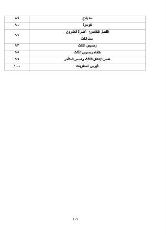 سا بتاح 89 تاوسرة 90 الفصل الخامس :الأسرة العشرون 91 ست نخت رمسيس الثالث 93 خلفاء رمسيس الثالث 95 عصر الإنتقال الثالث والعصر المتأخر 99 فهرس المحتويات 100 106
