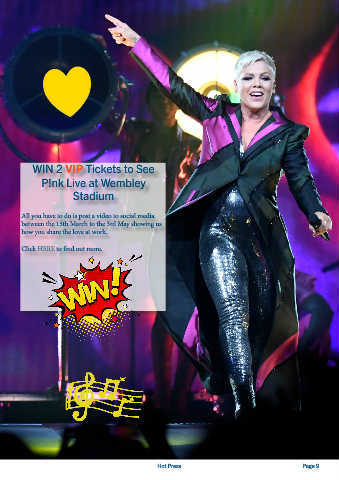 WIN 2 VIP Tickets to See P!nk Live at Wembley Stadium All you have to do is post a video to social media between the 15th March to the 3rd May showing us how you share the love at work. Click HERE to find out more. Hot Press Page 9