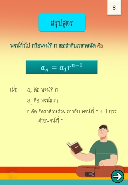 8 สรุปสูตร พจน์ทั่วไป หรือพจน์ที่ n ของล าดับเรขาคณิต คือ = − เมื่อ a คือ พจน์ที่ n n a คือ พจน์แรก 1 r คือ อัตราส่วนร่วม เท่ากับ พจน์ที่ n + 1 หาร ด้วยพจน์ที่ n