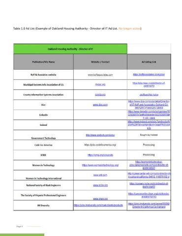 Table 1.0 Ad List (Example of Oakland Housing Authority - Director of IT Ad List. No longer active) Page 8 Page 9
