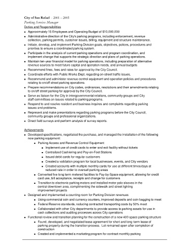 collection, parking permits, customer issues, billing, equipment and structure maintenance.