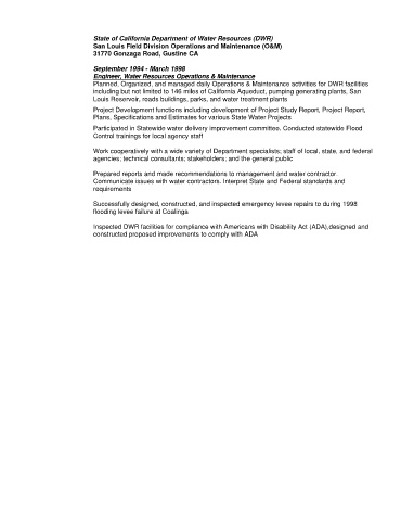 Participated in Statewide water delivery improvement committee. Conducted statewide Flood