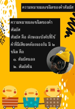 ความหมายและชนิดของค าสัมผัส ความหมายและชนิดของค า สัมผัส สัมผัส คือ ลักษณะบังคับที่ใช้ ค าที่มีเสียงคล้องจองกัน มี ๒ ชนิด คือ ๑. สัมผัสนอก ๒. สัมผัสใน 10