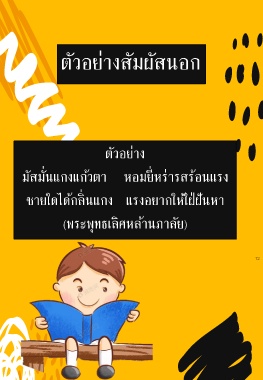 ตัวอย่างสัมผัสนอก ตัวอย่าง มัสมั่นแกงแก้วตา หอมยี่หร่ารสร้อนแรง ชายใดได้กลิ่นแกง แรงอยากให้ใฝ่ฝันหา (พระพุทธเลิศหล้านภาลัย) 12