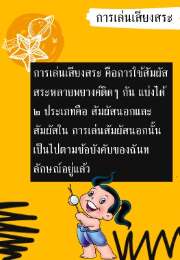 การเล่นเสียงสระ การเล่นเสียงสระ คือการใช้สัมผัส สระหลายพยางค์ติดๆ กัน แบ่งได้ ๒ ประเภทคือ สัมผัสนอกและ สัมผัสใน การเล่นสัมผัสนอกนั้น เป็นไปตามข้อบังคับของฉันท ลักษณ์อยู่แล้ว 7