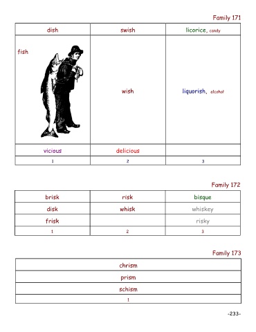 Family 171 dish swish licorice, candy fish wish liquorish, alcohol vicious delicious 1 2 3 Family 172 brisk risk bisque disk whisk whiskey frisk risky 1 2 3 Family 173 chrism prism schism 1 -233-