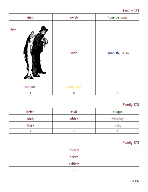 Family 171 dish swish licorice, candy fish wish liquorish, alcohol vicious delicious 1 2 3 Family 172 brisk risk bisque disk whisk whiskey frisk risky 1 2 3 Family 173 chrism prism schism 1 -233-