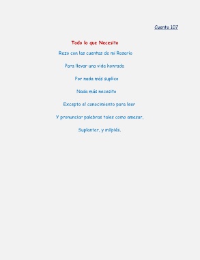 Cuento 107 Todo lo que Necesito Rezo con las cuentas de mi Rosario Para llevar una vida honrada Por nada más suplico Nada más necesito Excepto el conocimiento para leer Y pronunciar palabras tales como amasar, Suplantar, y milpiés.