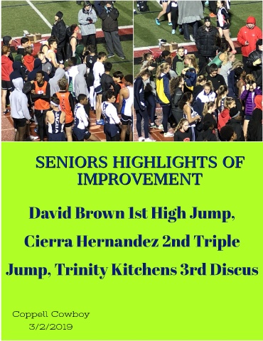 SENIORS HIGHLIGHTS OF SENIORS HIGHLIGHTS OF IMPROVEMENT IMPROVEMENT David Brown 1st High Jump, Cierra Hernandez 2nd Triple Jump, Trinity Kitchens 3rd Discus Coppell Cowboy 3/2/2019