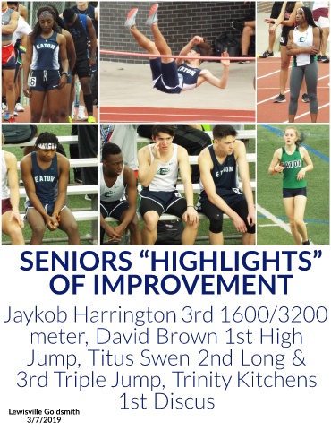 SENIORS “HIGHLIGHTS” OF IMPROVEMENT Jaykob Harrington 3rd 1600/3200 meter, David Brown 1st High Jump, Titus Swen 2nd Long & 3rd Triple Jump, Trinity Kitchens 1st Discus Lewisville Goldsmith 3/7/2019