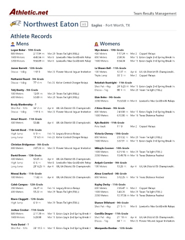 1600 Meters 4:45.56 PR Mar 8 Lewisville Max GoldSmith Relays 800 Meters 2:58.36 Mar 15 Eaton Eagle 2nd Spring Break In…