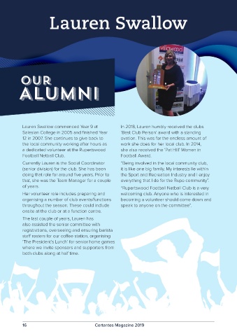 Lauren Swallow commenced Year 9 at In 2018, Lauren humbly received the clubs