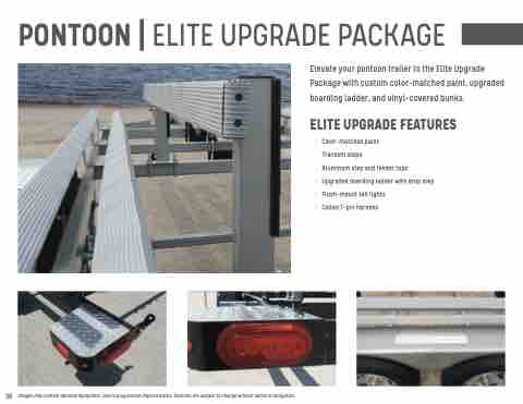 Elevate your pontoon trailer to the Elite Upgrade Package with custom color-matched paint, upgraded boarding ladder, and vinyl-covered bunks.
