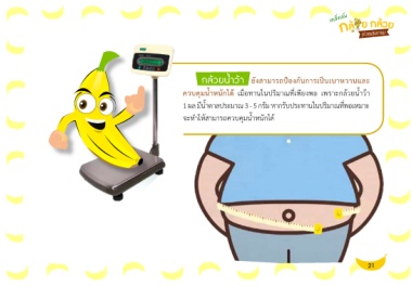 เคล็ดลับ ก ล้ ย กล้วย ช่วยสุขภาพ กล้วยน้ำว้า ยังสามารถป้องกันการเป็นเบาหวานและ ควบคุมน้ำหนักได้ เมื่อทานในปริมาณที่เพียงพอ เพราะกล้วยน้ำว้า 1 ผล มีน้ำตาลประมาณ 3 - 5 กรัม หากรับประทานในปริมาณที่พอเหมาะ จะทำให้สามารถควบคุมน้ำหนักได้ 21