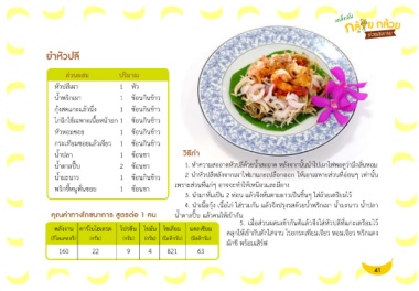 พลังงาน คาร์โบไฮเดรต โปรตีน ไขมัน โซเดียม แคลเซียม คลุกให้เข้ากันตักใส่จาน โรยกระเทียมเจียว หอมเจียว พริกแดง