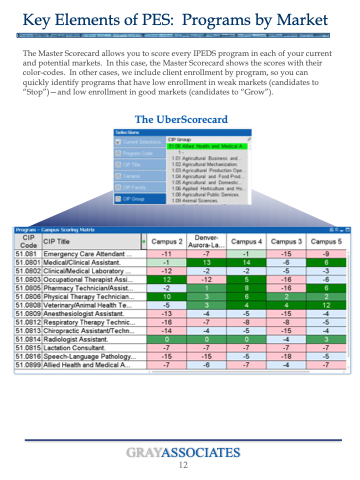 The Master Scorecard allows you to score every IPEDS program in each of your current and potential markets. In this case, the Master Scorecard shows the scores with their color-codes. In other cases, we include client enrollment by program, so you can quickly identify programs that have low enrollment in weak markets (candidates to “Stop”)—and low enrollment in good markets (candidates to “Grow”).