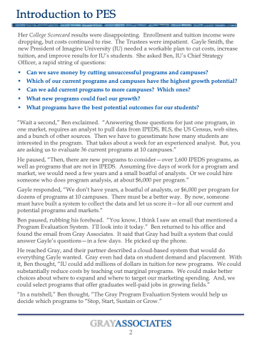 Ben paused, rubbing his forehead. “You know, I think I saw an email that mentioned a Program Evaluation System. I’ll look into it today.” Ben returned to his office and found the email from Gray Associates. It said that Gray had built a system that could answer Gayle’s questions—in a few days. He picked up the phone.