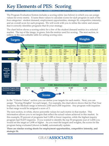 The Program Evaluation System includes a scoring rubric (see below) in which you can assign values for every metric. It sums these values to calculate scores for each program in each of the four categories: student demand, employment opportunities, strategic fit, competitive intensity, and an overall score for each program. We will work with you to refine the rubric and ensure that it correctly identifies programs that fit your strategy.