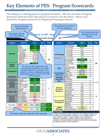 The ranking is a starting point for program decisions. PES also provides a Program Scorecard which provides data and your scores for over 40 metrics. Below is an illustrative Program Scorecard for Registered Nursing in Denver.