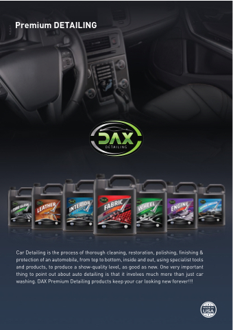 Car Detailing is the process of thorough cleaning, restoration, polishing, finishing & protection of an automobile, from top to bottom, inside and out, using specialist tools and products, to produce a show-quality level, as good as new. One very important thing to point out about auto detailing is that it involves much more than just car washing. DAX Premium Detailing products keep your car looking new forever!!!