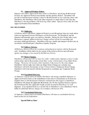 Operator will submit Approved Product orders to Distributor, specifying the Restaurant