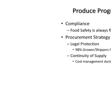 Produce Program Overview • Compliance – Food Safety is always first • Procurement Strategy – Legal Protection • 98% Grower/Shippers have signed contracts – Continuity of Supply • Cost management during active markets