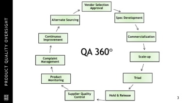 Vendor Selection Approval Spec Development Alternate Sourcing RSIGHT E Continuous Commercialization V Improvement O Y IT QA 360° AL Complaint Scale-up T QU Management C U D Product Triad RO Monitoring P Supplier Quality Control Hold & Release 3