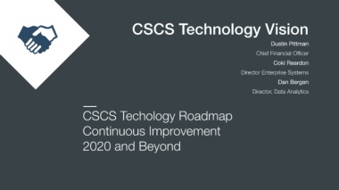 CSCS Technology Vision Dustin Pittman Chief Financial Officer Coki Reardon Director Enterprise Systems Dan Bergen Director, Data Analytics CSCS Techology Roadmap Continuous Improvement 2020 and Beyond