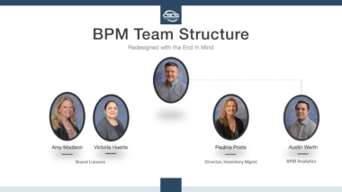 BPM Team Structure Redesigned with the End In Mind Amy Madison Victoria Huerta Paulina Poste Austin Werth Brand Liaisons Director, Inventory Mgmt BPM Analytics