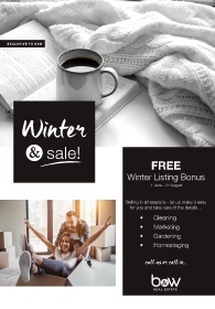EXCLUSIVE TO B&W Winter sale! FREE Winter Listing Bonus 1 June - 31 August Selling in all seasons - let us make it easy for you and take care of the details… • Cleaning • Marketing • Gardening • Homestaging call us or call in..