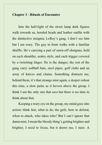 Into the half-light of the street lamp dark figures walk towards us, hooded heads and leather outfits with the distinctive insignia; LeRoy’s gang. I don’t see him but I am wary. The guy in front walks with a familiar shuffle. He’s carrying a pair of sawn-off shotguns, held on each shoulder, sentry style, and each trigger covered by a twitching finger. He is the danger; the rest of the gang carry softball bats, steel pipes, golf clubs and an array of knives and chains. Something distracts me, behind them, it’s that strange mist again, a deeper colour this time, a slow pulse as it hovers above the group. I think I am the only one that sees but there is no time to think about that.