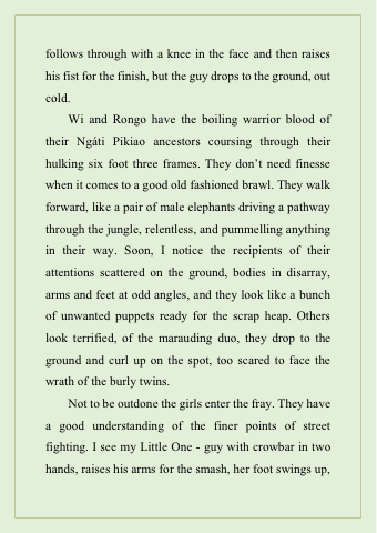 Wi and Rongo have the boiling warrior blood of their Ngáti Pikiao ancestors coursing through their hulking six foot three frames. They don’t need finesse when it comes to a good old fashioned brawl. They walk forward, like a pair of male elephants driving a pathway through the jungle, relentless, and pummelling anything in their way. Soon, I notice the recipients of their attentions scattered on the ground, bodies in disarray, arms and feet at odd angles, and they look like a bunch of unwanted puppets ready for the scrap heap. Others look terrified, of the marauding duo, they drop to the ground and curl up on the spot, too scared to face the wrath of the burly twins.