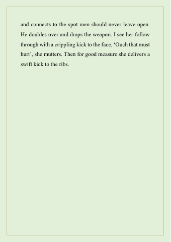 and connects to the spot men should never leave open. He doubles over and drops the weapon. I see her follow through with a crippling kick to the face, ‘Ouch that must hurt’, she mutters. Then for good measure she delivers a swift kick to the ribs.