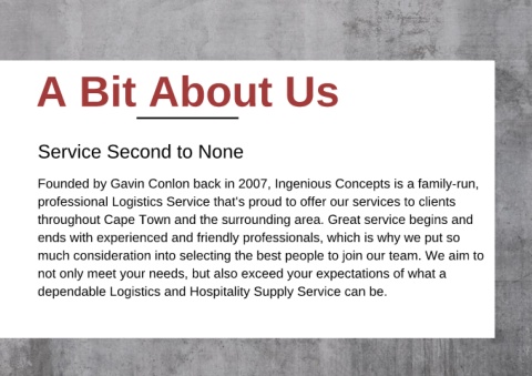 Page 2 - A Bit About Us Service Second to None Founded by Gavin Conlon back in 2007, Ingenious Concepts is a professional Logistics Service that’s proud to offer our services to clients throughout Cape Town and the surrounding area. Great service begins and ends