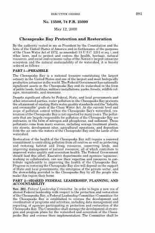 By the authority vested in me as President by the Constitution and the laws of the United States of America and in furtherance of the purposes of the Clean Water Act of 1972, as amended (33 U.S.C. 1251 et seq.), and other laws, and to protect and restore the health, heritage, natural resources, and social and economic value of the Nation’s largest estuarine ecosystem and the natural sustainability of its watershed, it is hereby ordered as follows: