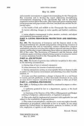 Sec. 901. The Secretaries of Commerce and the Interior shall, to the extent permitted by law, identify and prioritize critical living resources of the Chesapeake Bay and its watershed, conduct collaborative research and habitat protection activities that address expected outcomes for these species, and develop a report addressing these topics as required in section 202 of this order. The Secretaries of Commerce and the Interior shall coordinate agency activities related to living resources in estuarine waters to ensure maximum benefit to the Chesapeake Bay resources.