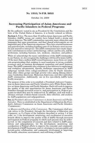 The purpose of this order is to establish a President’s Advisory Commis- sion on Asian Americans and Pacific Islanders and a White House Initia- tive on Asian Americans and Pacific Islanders. Each will work to improve the quality of life and opportunities for Asian Americans and Pacific Islanders through increased access to, and participation in, Federal pro- grams in which they may be underserved. In addition, each will work to advance relevant evidence-based research, data collection, and analysis for AAPI populations and subpopulations.