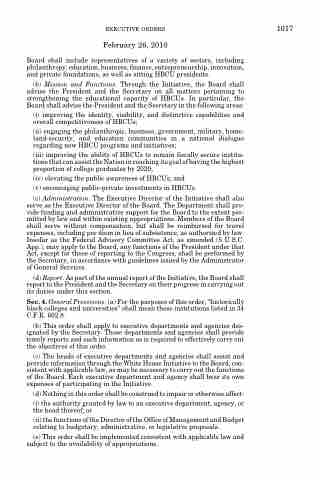 (b) Mission and Functions. Through the Initiative, the Board shall advise the President and the Secretary on all matters pertaining to strengthening the educational capacity of HBCUs. In particular, the Board shall advise the President and the Secretary in the following areas: