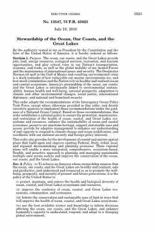 This order adopts the recommendations of the Interagency Ocean Policy Task Force, except where otherwise provided in this order, and directs executive agencies to implement those recommendations under the guid- ance of a National Ocean Council. Based on those recommendations, this order establishes a national policy to ensure the protection, maintenance, and restoration of the health of ocean, coastal, and Great Lakes eco- systems and resources, enhance the sustainability of ocean and coastal economies, preserve our maritime heritage, support sustainable uses and access, provide for adaptive management to enhance our understanding of and capacity to respond to climate change and ocean acidification, and coordinate with our national security and foreign policy interests.