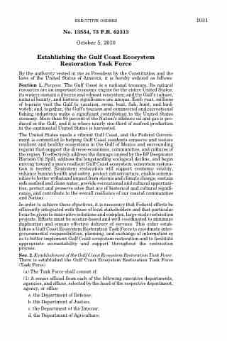 Section 1. Purpose. The Gulf Coast is a national treasure. Its natural resources are an important economic engine for the entire United States; its waters sustain a diverse and vibrant ecosystem; and the Gulf’s culture, natural beauty, and historic significance are unique. Each year, millions of tourists visit the Gulf to vacation, swim, boat, fish, hunt, and bird- watch; and, together, the Gulf’s tourism and commercial and recreational fishing industries make a significant contribution to the United States economy. More than 90 percent of the Nation’s offshore oil and gas is pro- duced in the Gulf, and it is where nearly one-third of seafood production in the continental United States is harvested.