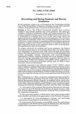 Section 1. Policy. The Federal Government benefits from a diverse workforce that includes students and recent graduates, who infuse the workplace with their enthusiasm, talents, and unique perspectives. The existing competitive hiring process for the Federal civil service, however, is structured in a manner that, even at the entry level, favors job applicants who have significant previous work experience. This structure, along with the complexity of the rules governing admission to the career civil service, creates a barrier to recruiting and hiring students and recent graduates. It places the Federal Government at a competitive disadvan- tage compared to private-sector employers when it comes to hiring quali- fied applicants for entry-level positions.