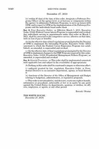 Sec. 8. Prior Executive Orders. (a) Effective March 1, 2011, Executive Order 13162 (Federal Career Intern Program) is superseded and revoked. Any individuals serving in appointments under that order on March 1, 2011, shall be converted to the competitive service, effective on that date, with no loss of pay or benefits.