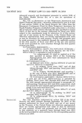 SEC. 131. (a) EXTENSION OF THE TEMPORARY ASSISTANCE FOR NEEDY FAMILIES PROGRAM.—Activities authorized by part A of title IV and section 1108(b) of the Social Security Act (other than the Emergency Contingency Fund for State Temporary Assistance for Needy Families Programs established under subsection (c) of section 403 of such Act) shall continue through the date specified in section 106(3) of this Act in the manner authorized for fiscal year 2010, subject to the amendments made by subsection (b) of this section, and out of any money in the Treasury of the United States not otherwise appropriated, there are hereby appropriated such sums as may be necessary for such purpose. Grants and payments may be made pursuant to this authority through the applicable portion of the first quarter of fiscal year 2011 at the pro rata portion of the level provided for such activities through the first quarter of fiscal year 2010.