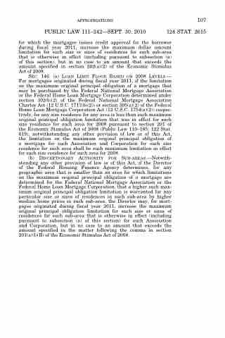 SEC. 146. (a) LOAN LIMIT FLOOR BASED ON 2008 LEVELS.— For mortgages originated during fiscal year 2011, if the limitation on the maximum original principal obligation of a mortgage that may be purchased by the Federal National Mortgage Association or the Federal Home Loan Mortgage Corporation determined under section 302(b)(2) of the Federal National Mortgage Association Charter Act (12 U.S.C. 1717(b)(2)) or section 305(a)(2) of the Federal Home Loan Mortgage Corporation Act (12 U.S.C. 1754(a)(2)) respec- tively, for any size residence for any area is less than such maximum original principal obligation limitation that was in effect for such size residence for such area for 2008 pursuant to section 201 of the Economic Stimulus Act of 2008 (Public Law 110–185; 122 Stat. 619), notwithstanding any other provision of law or of this Act, the limitation on the maximum original principal obligation of a mortgage for such Association and Corporation for such size residence for such area shall be such maximum limitation in effect for such size residence for such area for 2008.