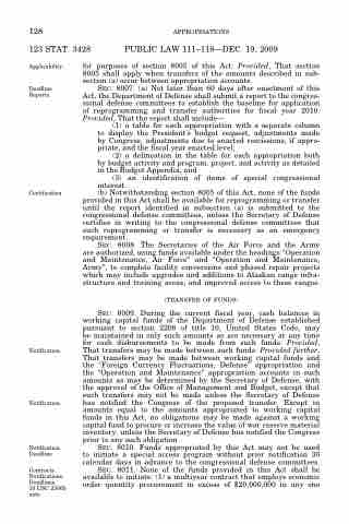 SEC. 8007. (a) Not later than 60 days after enactment of this Act, the Department of Defense shall submit a report to the congres- sional defense committees to establish the baseline for application of reprogramming and transfer authorities for fiscal year 2010: Provided, That the report shall include—