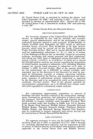 For necessary expenses of the United States Fish and Wildlife Service, as authorized by law, and for scientific and economic studies, general administration, and for the performance of other authorized functions related to such resources, $1,269,406,000, to remain available until September 30, 2011 except as otherwise provided herein: Provided, That $2,500,000 is for high priority projects, which shall be carried out by the Youth Conservation Corps: Provided further, That not to exceed $22,103,000 shall be used for implementing subsections (a), (b), (c), and (e) of section 4 of the Endangered Species Act, as amended, (except for processing petitions, developing and issuing proposed and final regulations, and taking any other steps to implement actions described in sub- section (c)(2)(A), (c)(2)(B)(i), or (c)(2)(B)(ii)), of which not to exceed $11,632,000 shall be used for any activity regarding the designation of critical habitat, pursuant to subsection (a)(3), excluding litigation support, for species listed pursuant to subsection (a)(1) prior to October 1, 2009: Provided further, That of the amount available for law enforcement, up to $400,000, to remain available until expended, may at the discretion of the Secretary be used for pay- ment for information, rewards, or evidence concerning violations of laws administered by the Service, and miscellaneous and emer- gency expenses of enforcement activity, authorized or approved by the Secretary and to be accounted for solely on the Secretary’s certificate: Provided further, That of the amount provided for environmental contaminants, up to $1,000,000 may remain avail- able until expended for contaminant sample analyses.